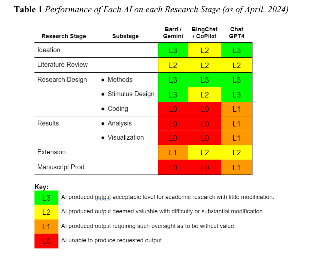The authors provide a matrix evaluating AI performance across all stages: